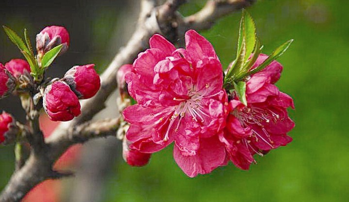 桃花,屬薔薇科,落葉小喬木,高可達(dá)6一8米。樹(shù)干灰褐色,粗糙有孔。小枝紅褐色或褐綠色,平滑。葉橢圓狀披針形,邊緣有細(xì)鋸齒;▎紊,有白、粉紅、紅等色,重瓣或半重瓣,花期3月。核果近球形,表面密被短絨毛,因品種不同,果熟6一9月。