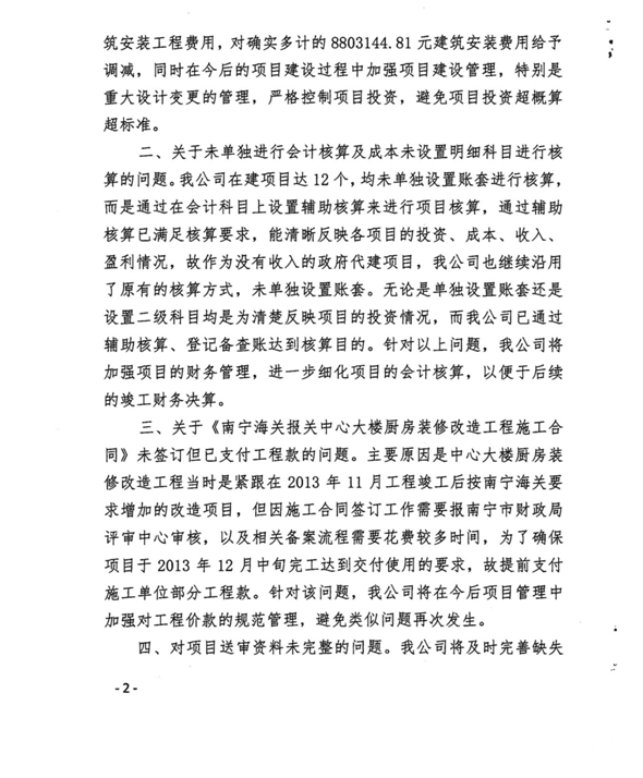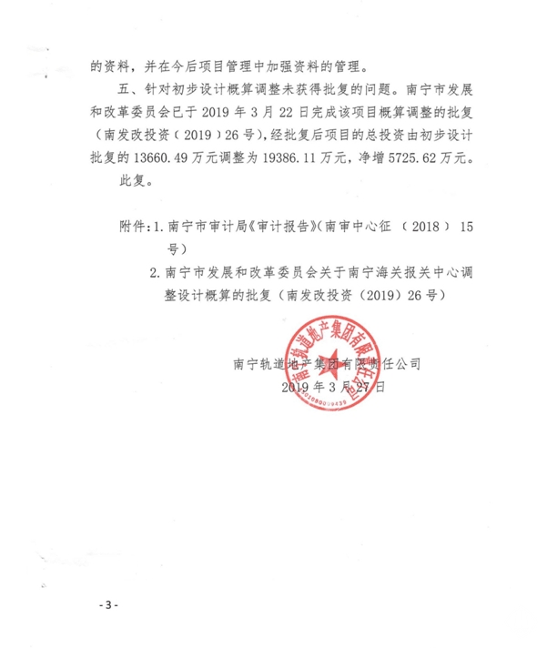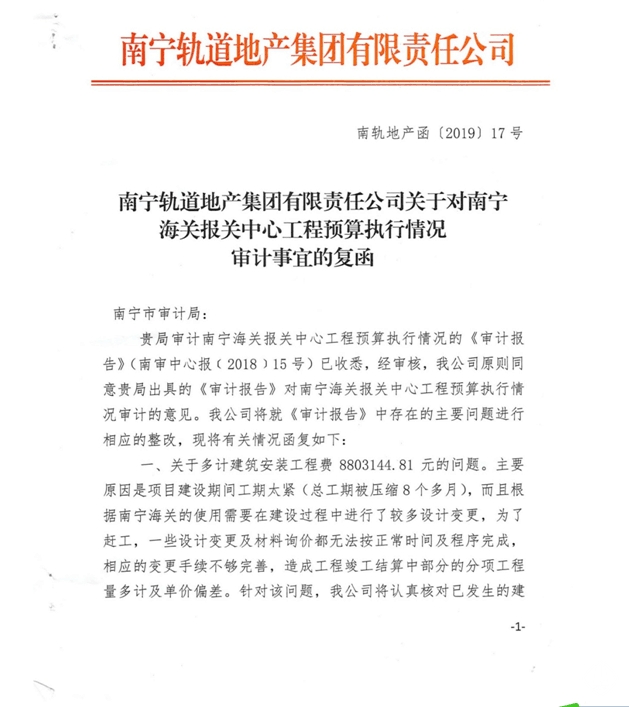 南寧軌道地產(chǎn)集團有限責(zé)任公司關(guān)于對南寧海關(guān)報關(guān)中心工程預(yù)算執(zhí)行情況審計事宜的復(fù)函